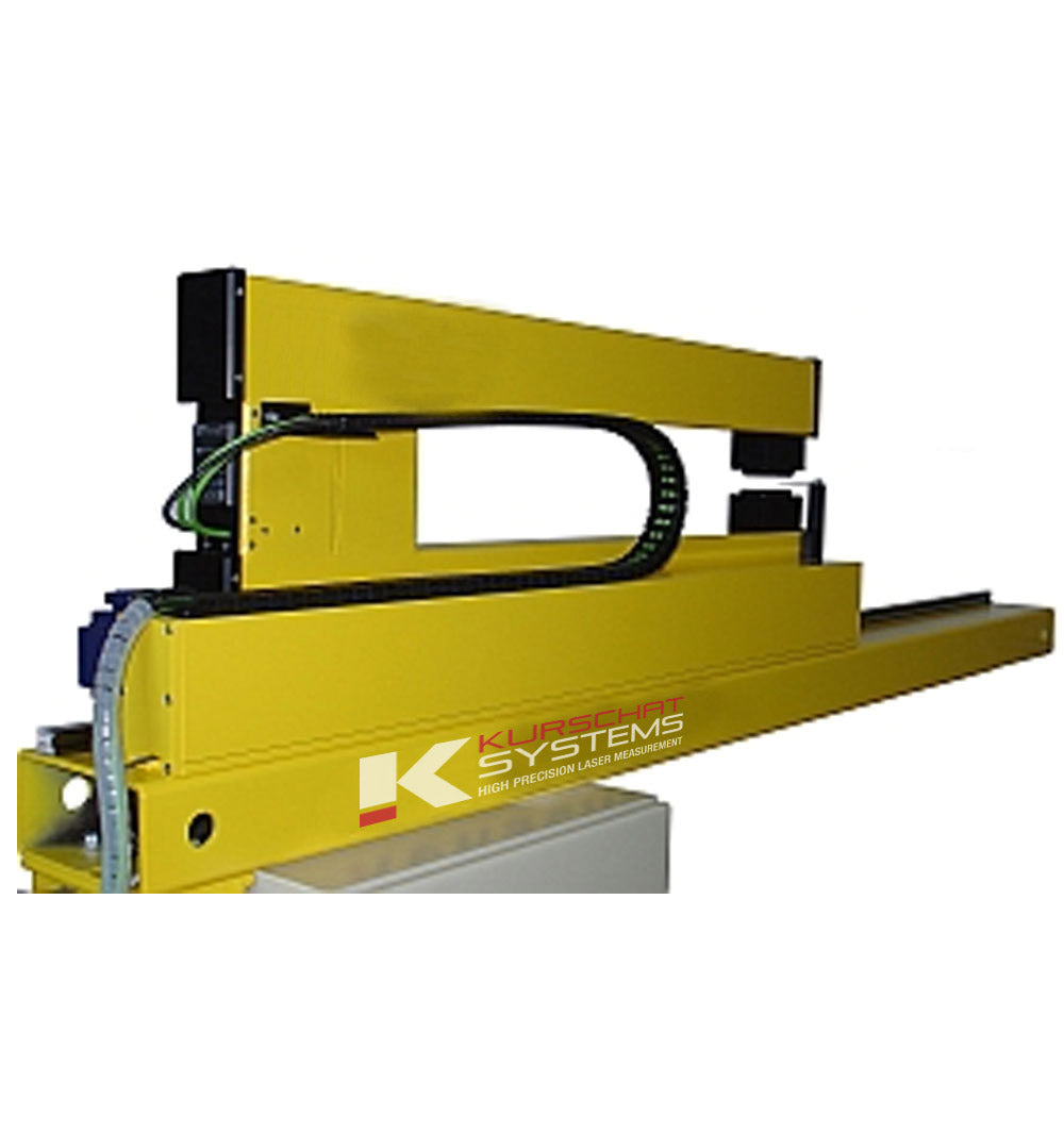 Berührungslose Inline-Dickenmessung mit traversierenden Laser-Triangulationssensoren in C-Rahmen und Messbereichen bis zu 1.100 mm je Lasermessbügel. Ausgelegt für die Messung von gegossenen Folien und Platten.